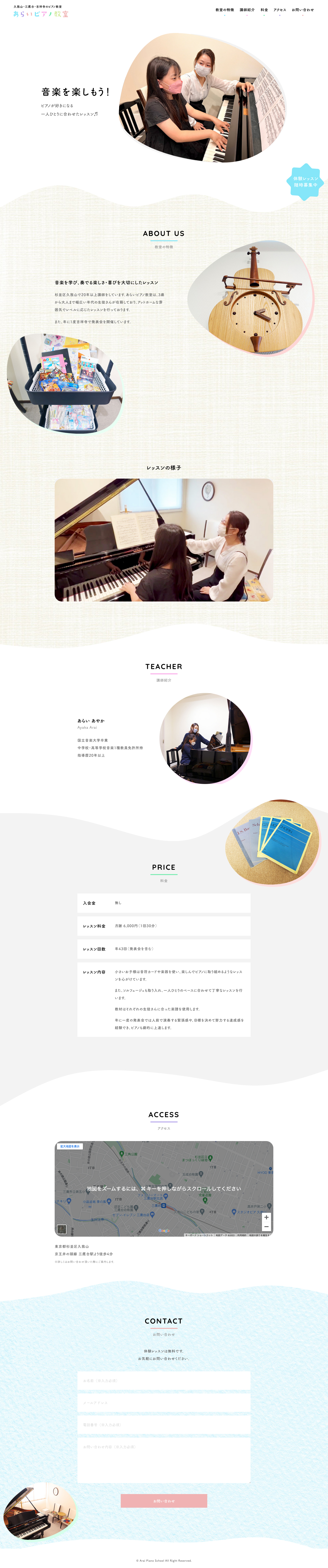 久我山・三鷹台・吉祥寺を中心に生徒さんが通うピアノ教室【ARAI PIANO SCHOOL】様のウェブサイトを制作しました。新規ウェブサイト立ち上げに伴い、プランニング、デザイン、コーディングなどを担当させていただきました。VISIT WEBSITE https://arai-piano.com/