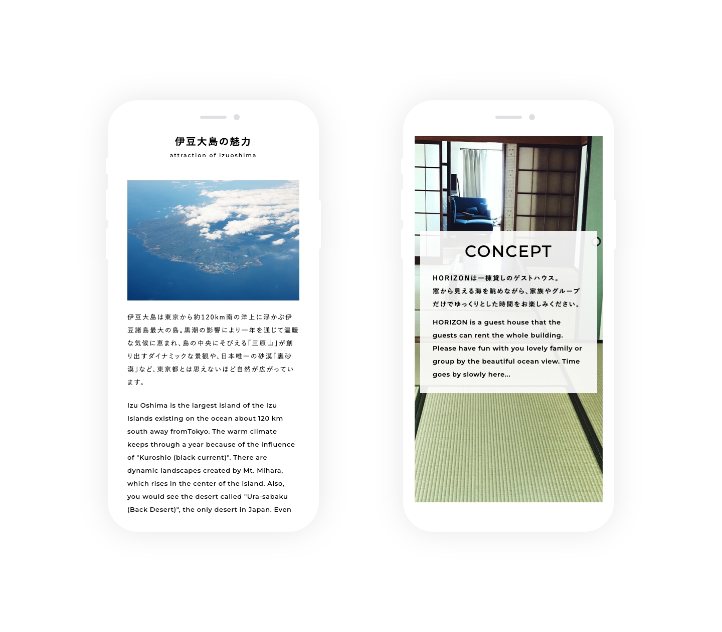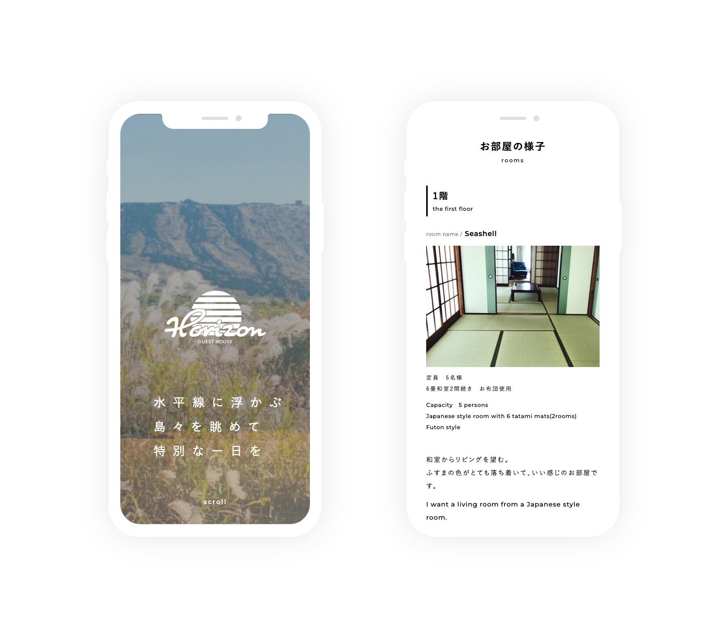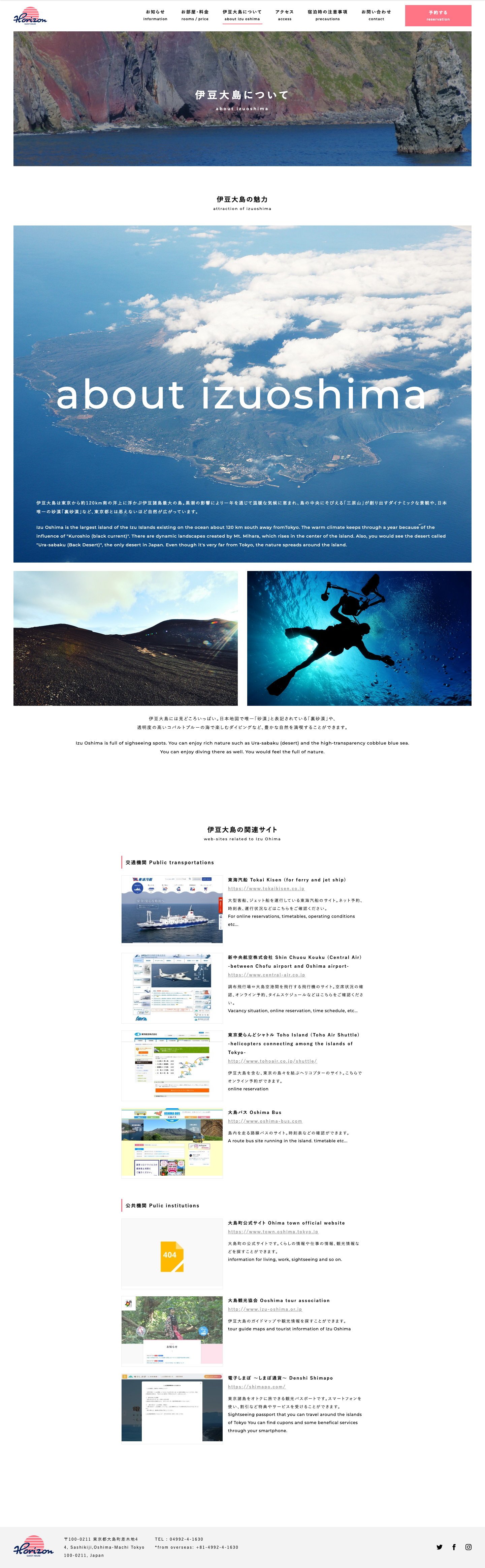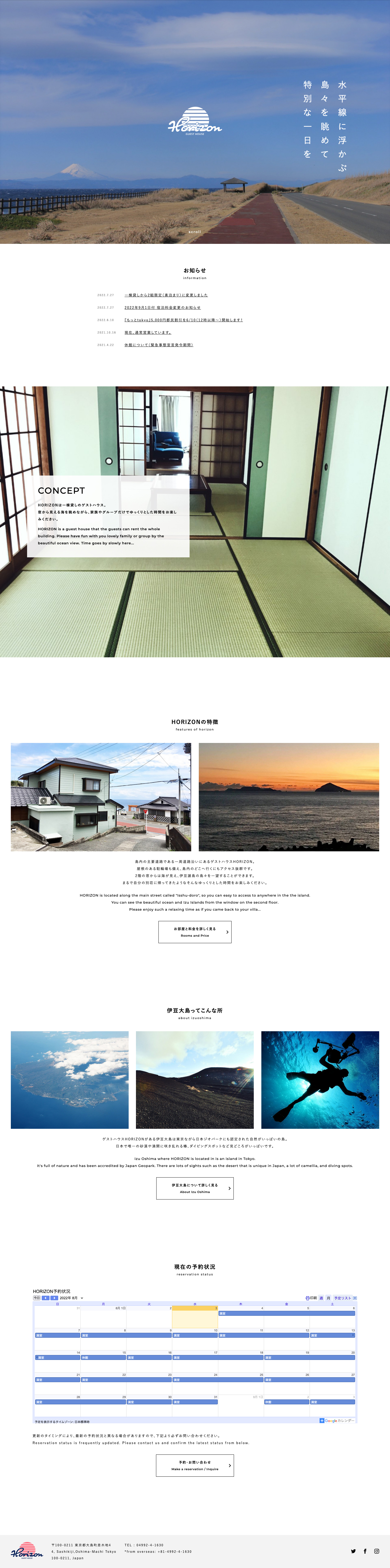 伊豆大島にある【ゲストハウスHORIZON】のウェブサイトをリニューアルしました。リニューアルに伴い、プランニング、デザイン、コーディング、WordPressによるサイト構成などを担当させていただきました。VISIT WEBSITE https://horizon-izuoshima.jp/