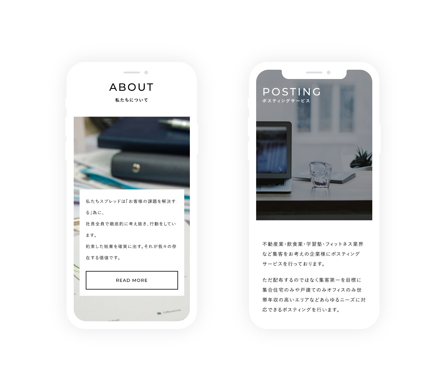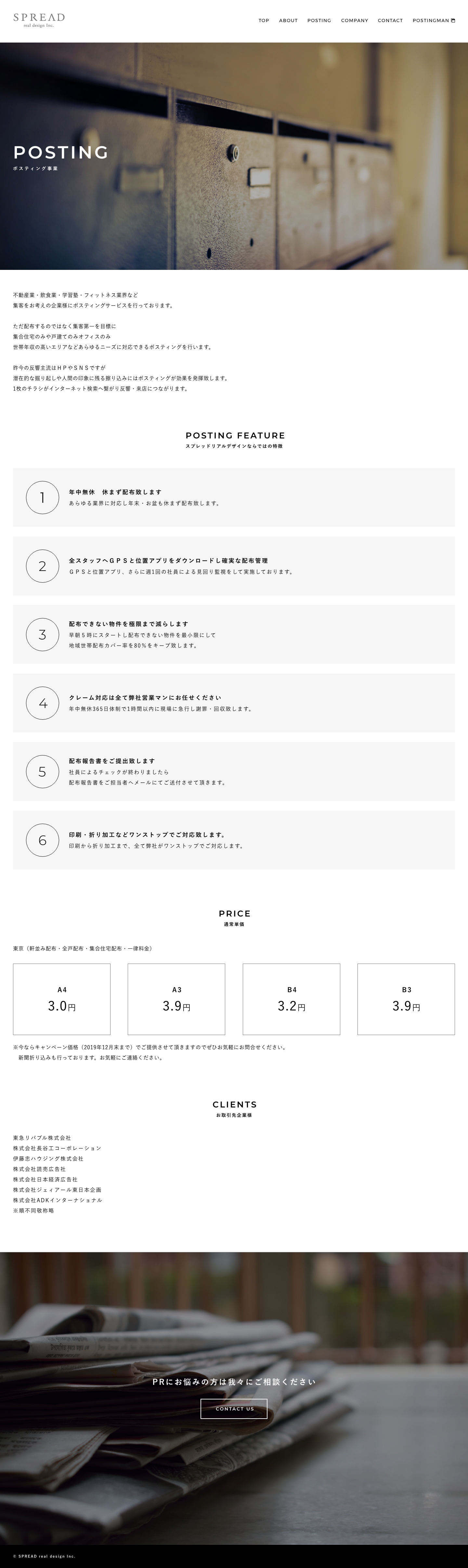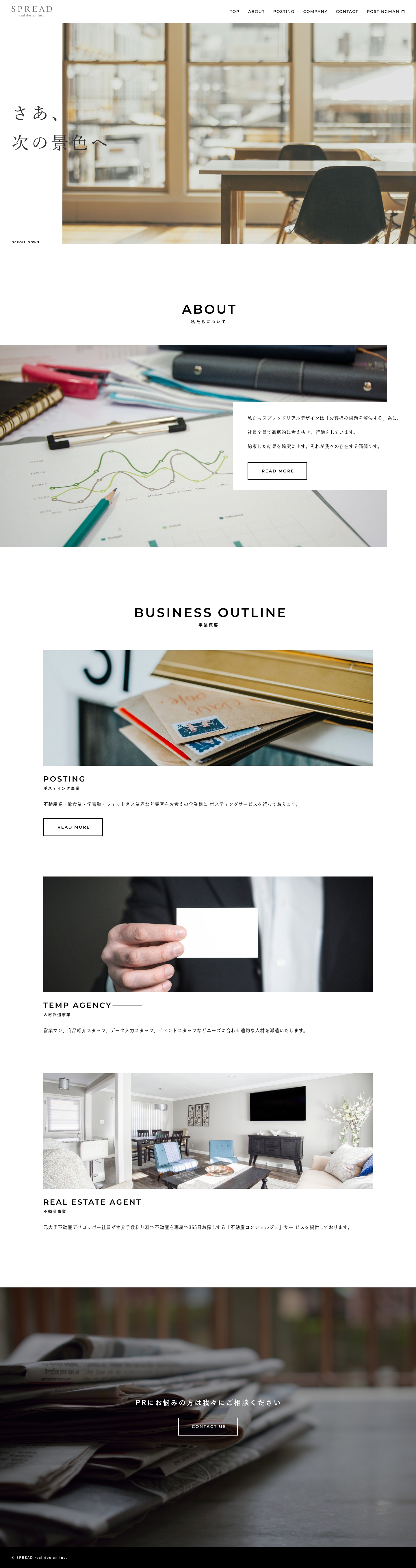 ポスティングサービスを行う【株式会社スプレッド】様のウェブサイトを制作しました。新規ウェブサイト立ち上げに伴い、プランニング、デザイン、コーディング、WordPressによるサイト構築を担当させていただきました。VISIT WEBSITE https://spread-rd.co.jp/
